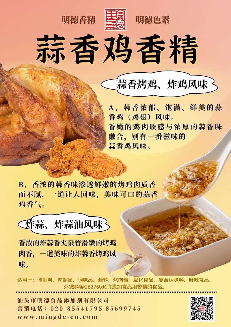 明德蒜香風(fēng)味系列香精 多級蒜香 覆蓋多場景汕頭市明德食品添加劑有限公司推出的蒜香風(fēng)味系列香精,覆蓋水溶性、油溶性與粉末等多種形態(tài),既能呈現(xiàn)新鮮大蒜、炸蒜、熟蒜油等不同調(diào)性,又兼顧耐溫與留香表現(xiàn),適用于醬料、肉制品、調(diào)味品、休閑零食及復(fù)合調(diào)味等B端應(yīng)用。以下為本系列核心單品與香氣描述